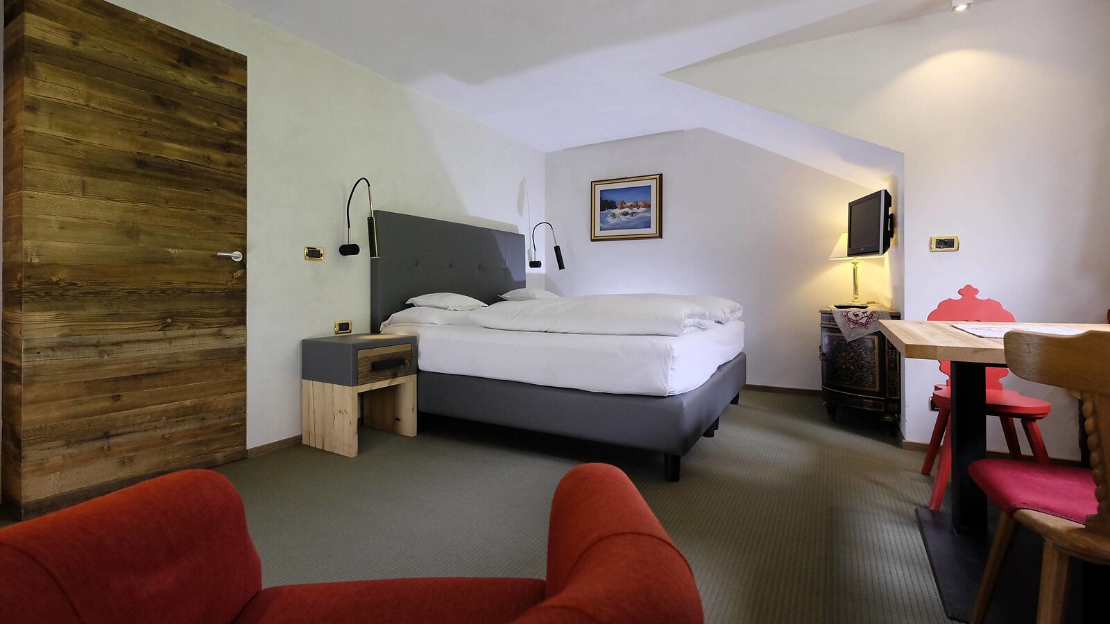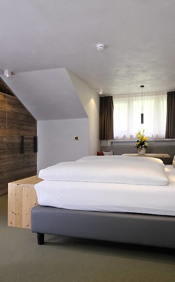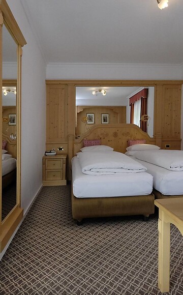 Doppelzimmer für zwei Personen, komfortabel eingerichtet, mit der Möglichkeit in einigen Zimmern ein drittes Zustellbett hinzuzufügen. Mit Bad oder Dusche, Fön, Bademantel, Satelliten-TV, Telefon, Minibar, Safe und wi-fi.